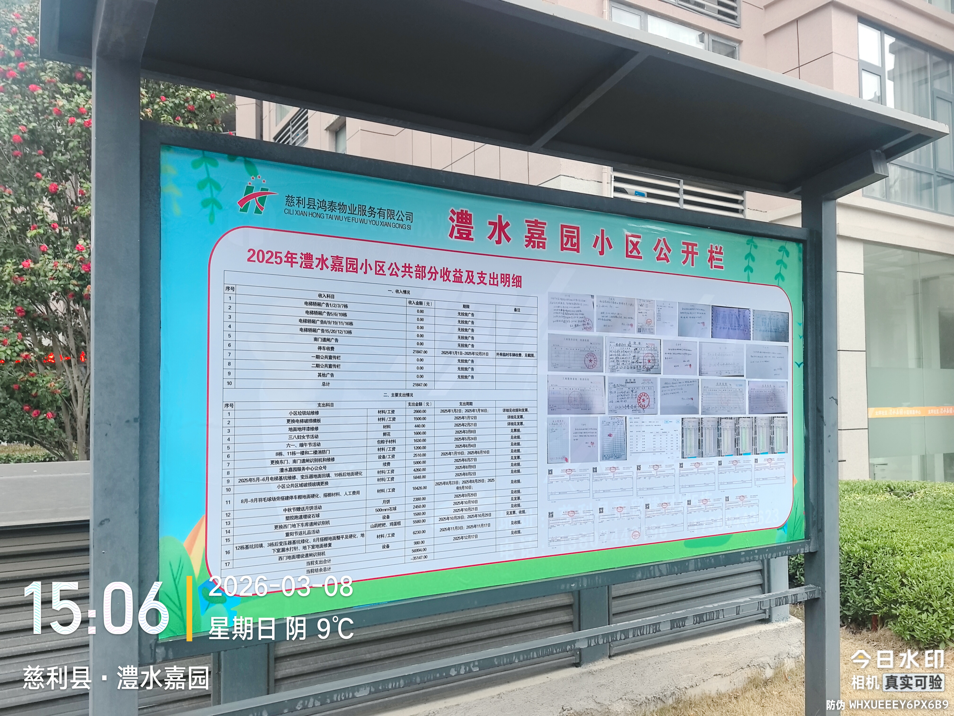 2025年的澧水嘉园小区公共部分收益及收益支出明细2026年3月8日已在公示栏里公布。想要了解详情的业主可以在公示栏查看。
