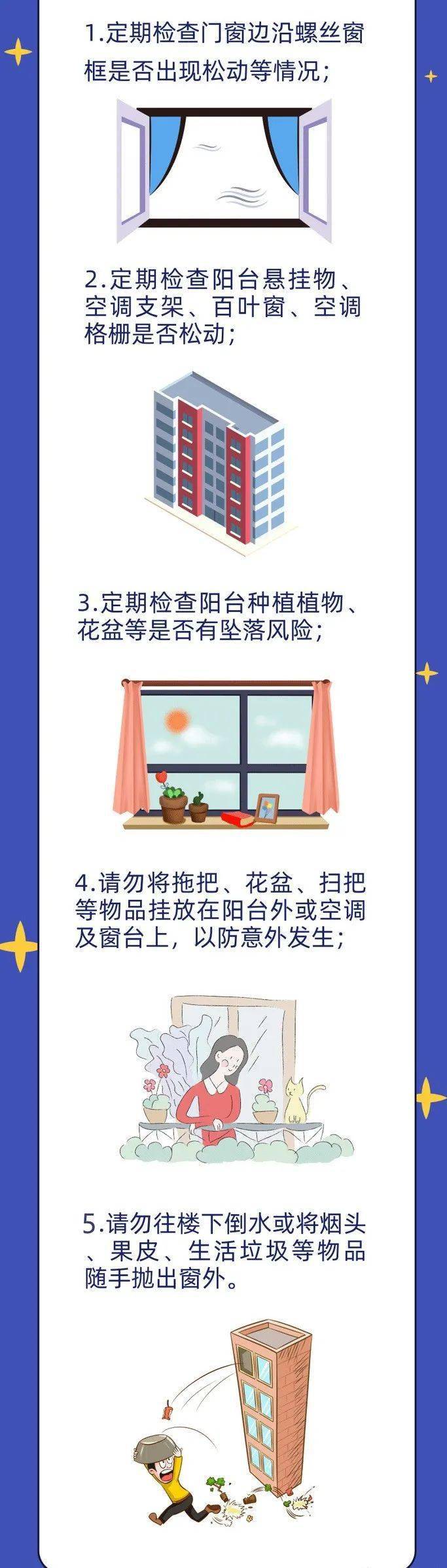 2. 请业主不要在室外阳台外沿及窗户外沿摆放盆栽、放置拖把等物品,经常检查窗户、空调支架等是否牢固,所安装防盗网、窗台外立面是否存在开裂松动现象,如有松动应及时加固,并做好楼上楼下防护后修复。