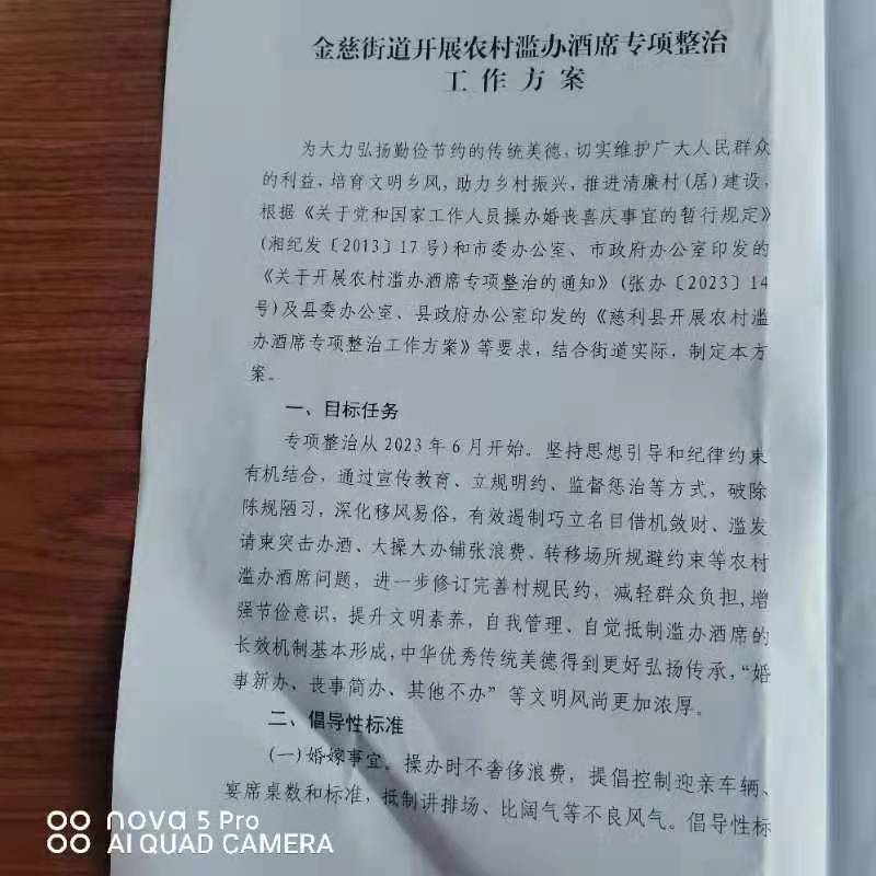 由市纪委监委罗湘平副书记带队的农村滥办酒席专项整治工作暗访组已进驻慈利,请各村居按照“婚事新办、丧事简办、其他不办”的原则,加强宣传、巡查、劝导。