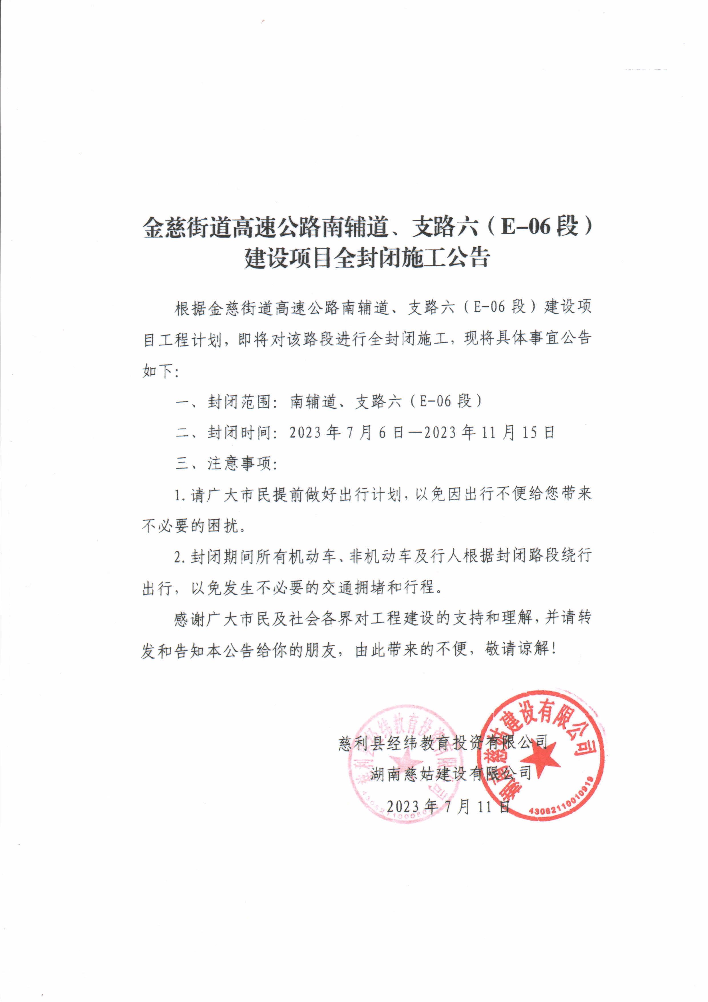 金慈街道高速公路南辅道、支路(E-06段)建设项目全封闭施工公告