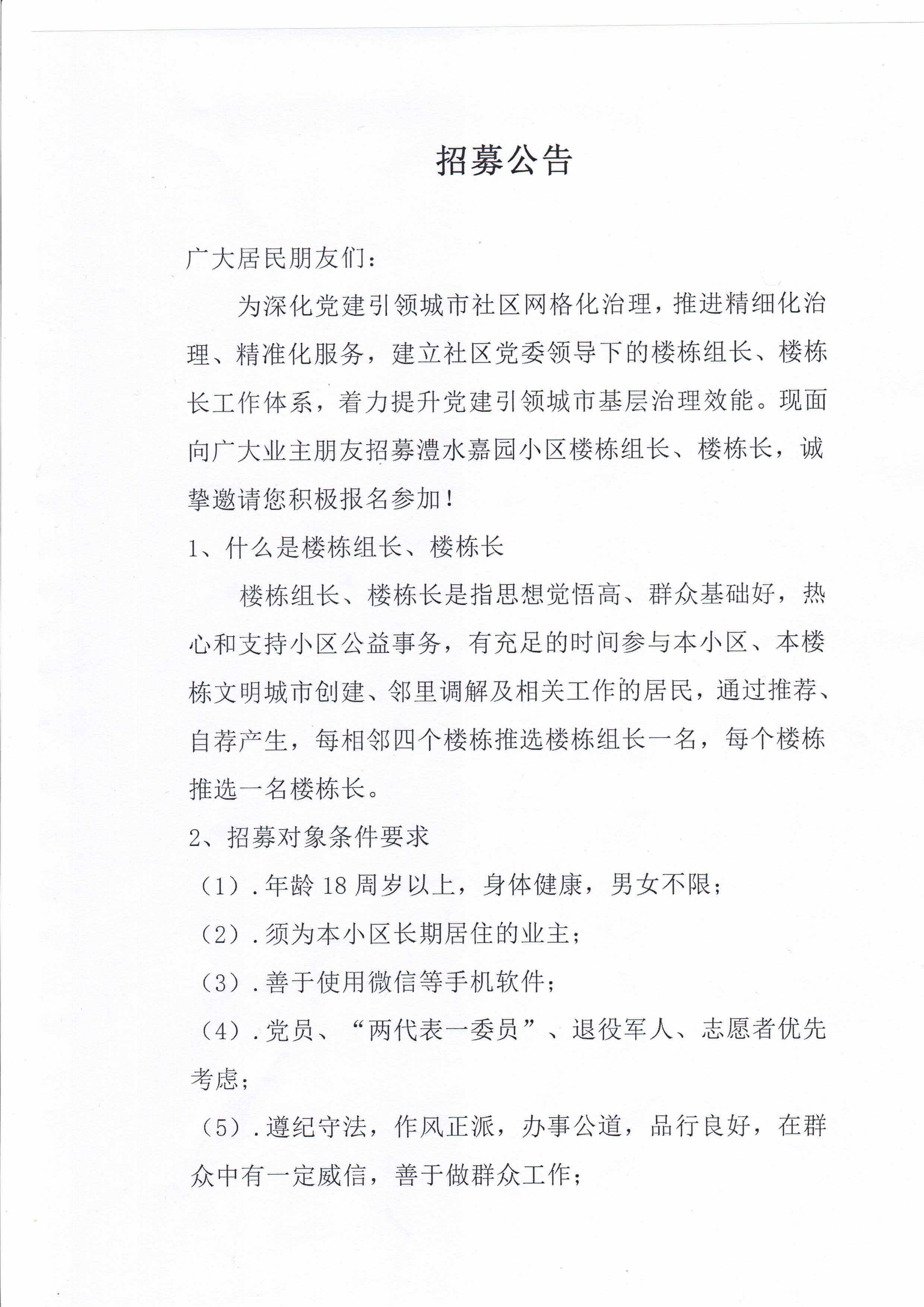 太坪社区招募楼栋组长、楼栋长公告