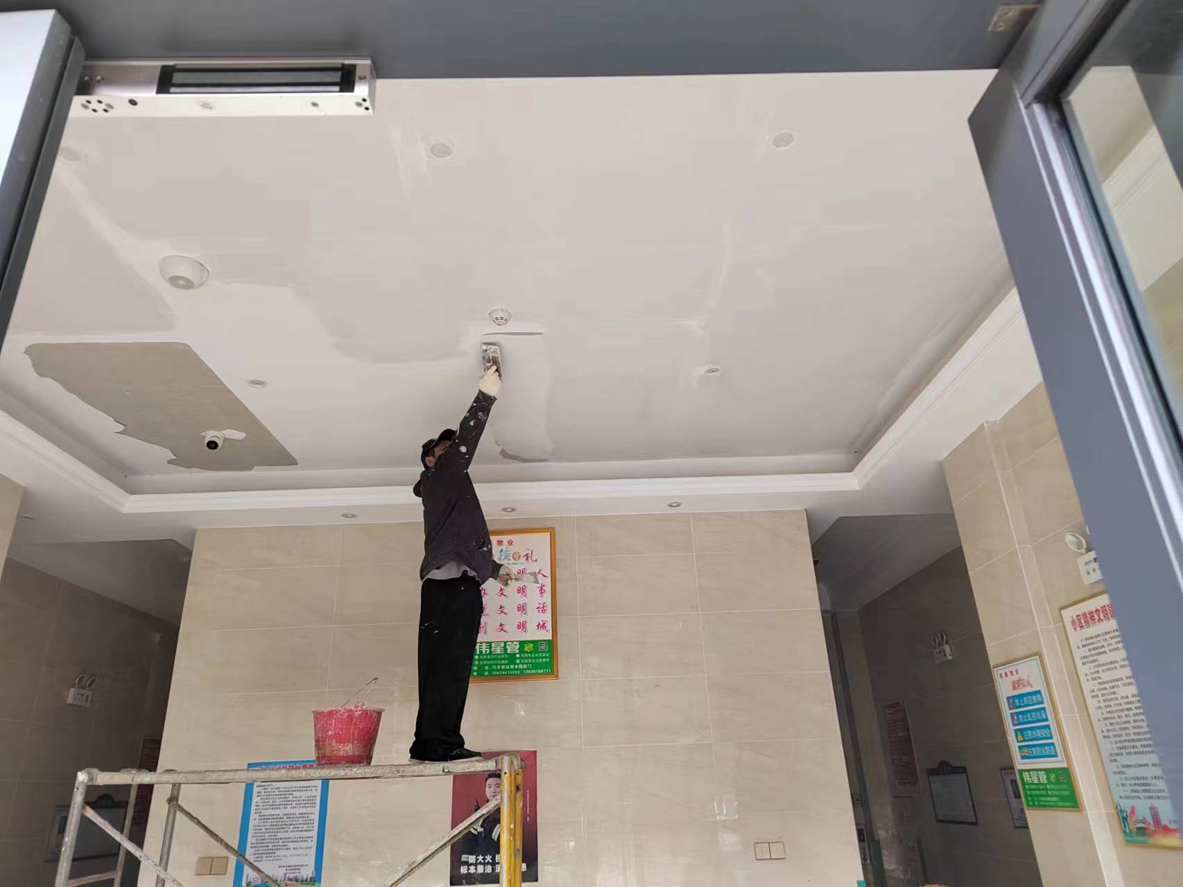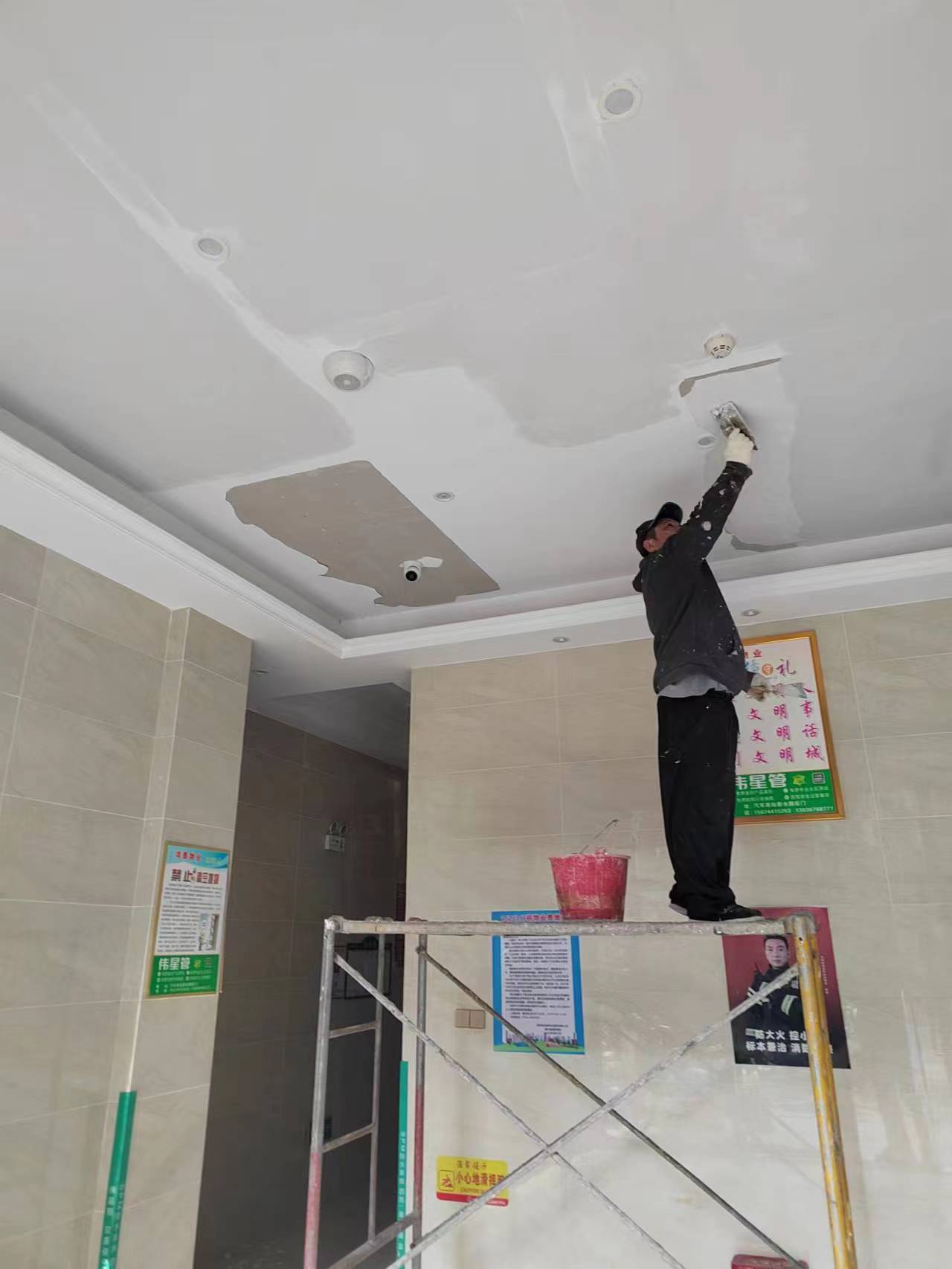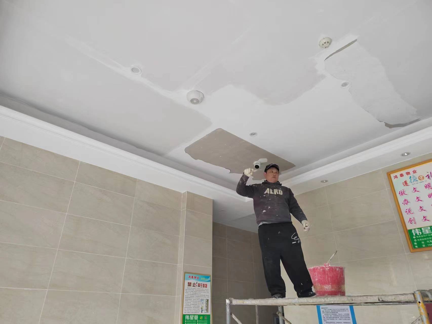 二、楼栋大厅天花板墙皮脱落,工人进行修补工作。