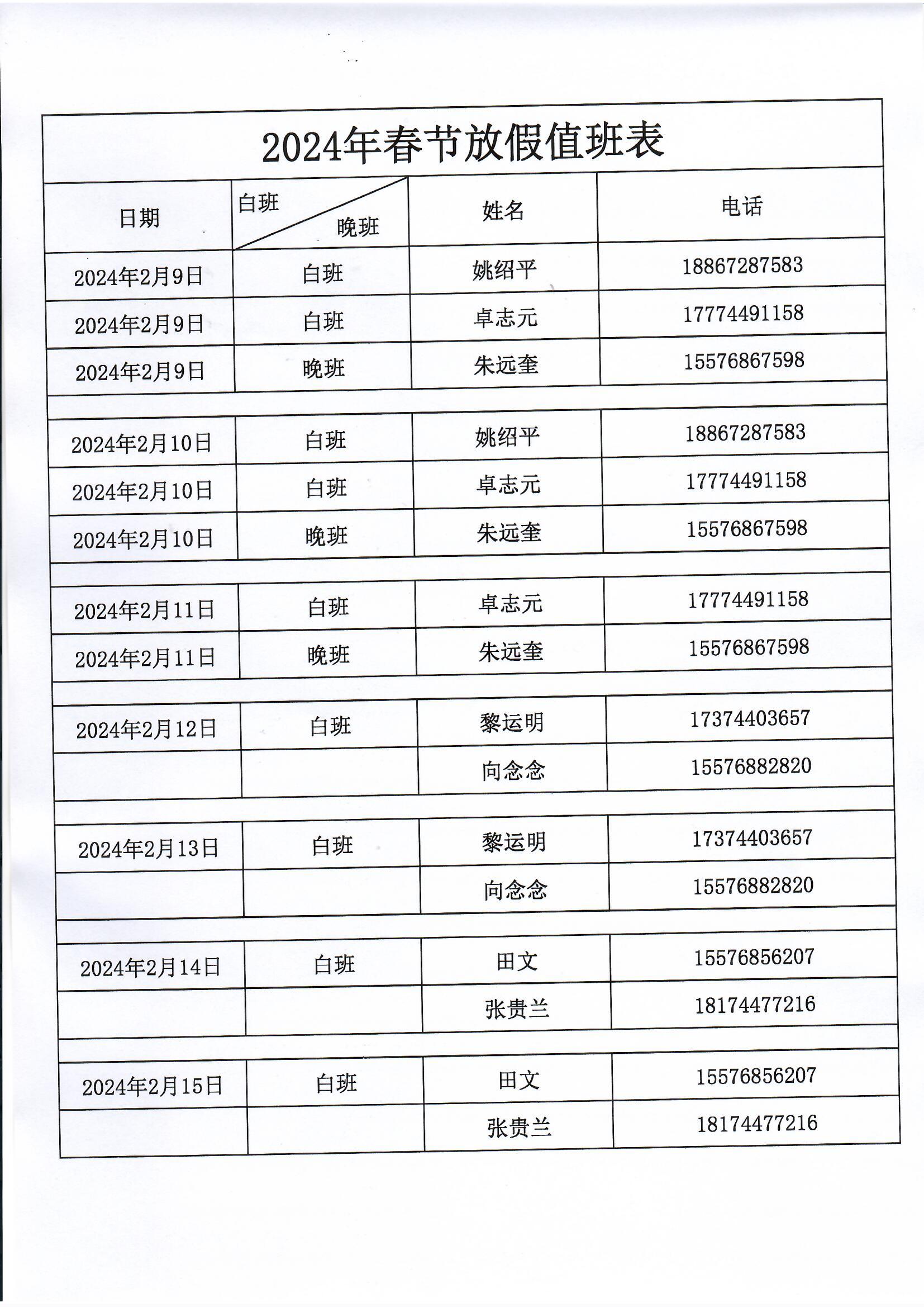 2024年春节放假值班安排