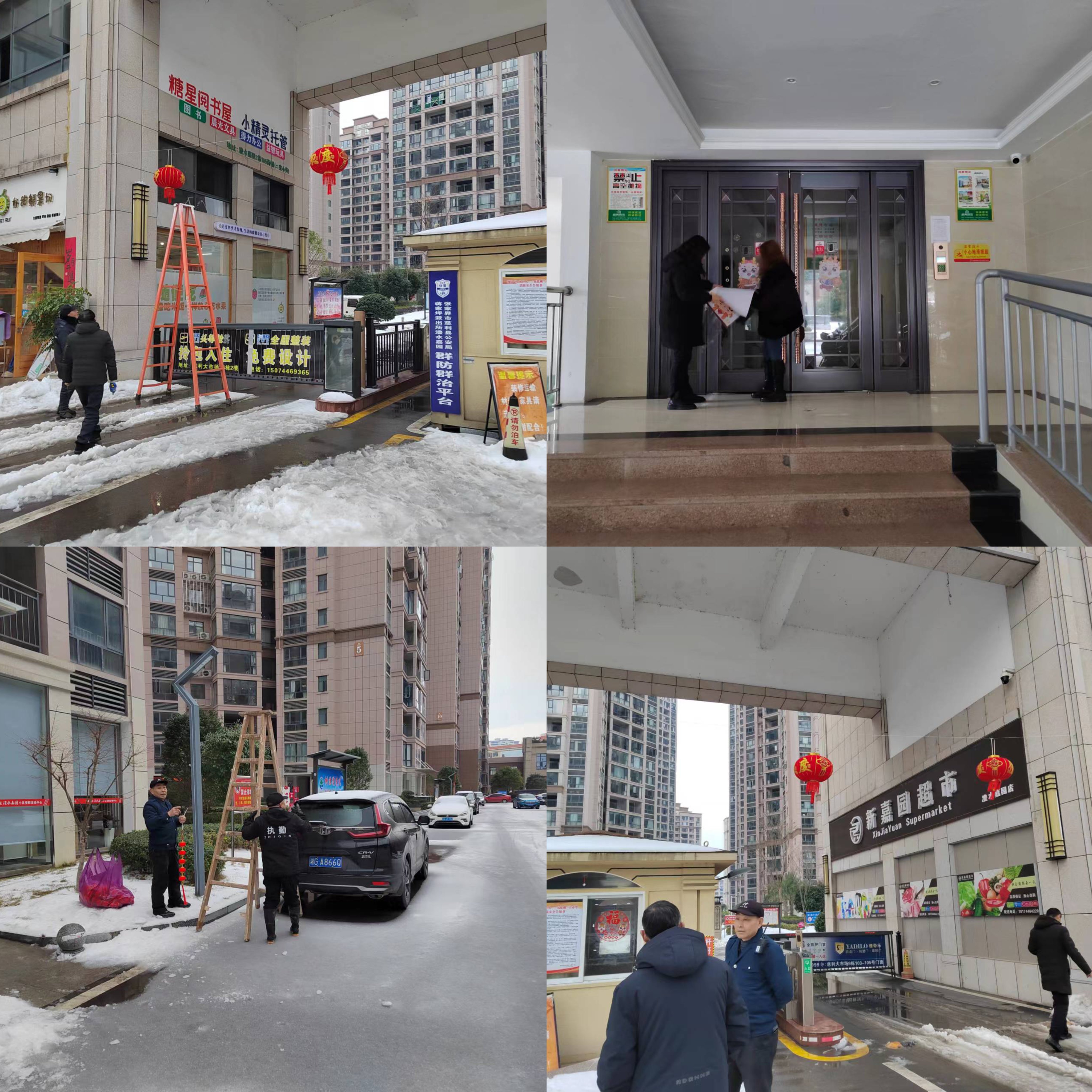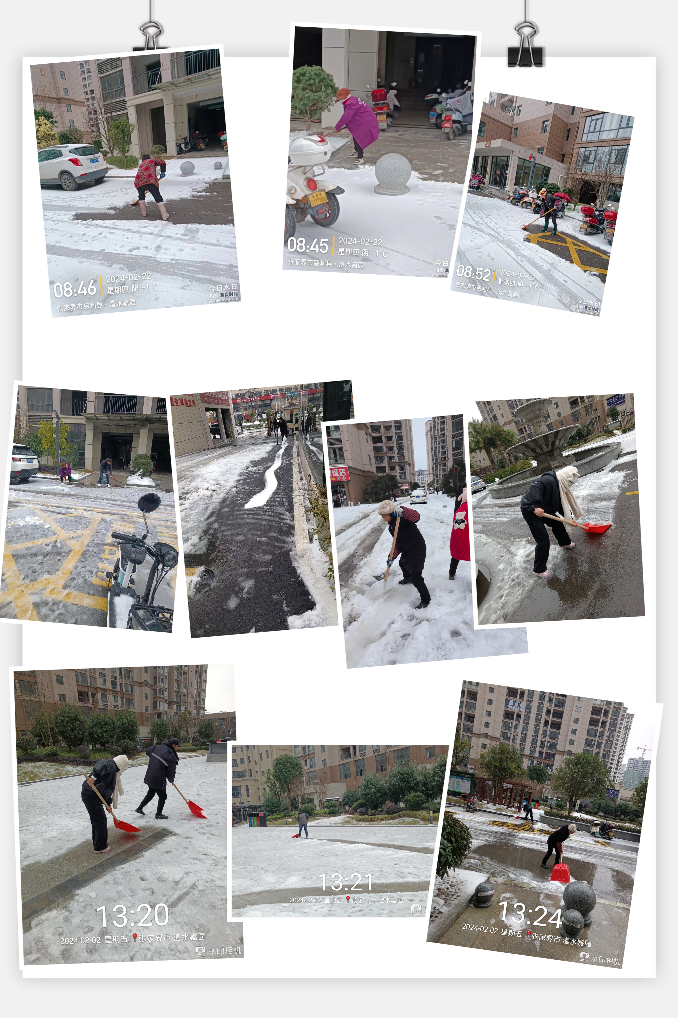 二、雪景虽美,也为大家的出行带来了不便,在寒冷的天气中,物业工作人员和小区热心业主出动,大家挥舞着扫帚、除雪铲等工具清理路面积雪,为大家清理安全的通行道路。