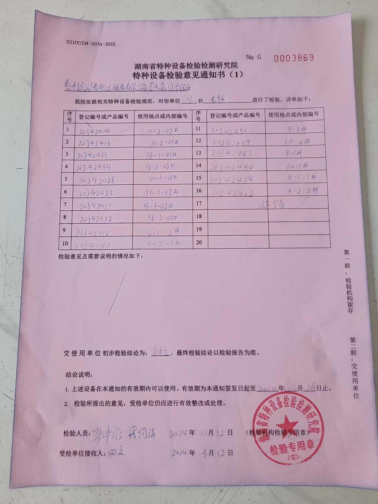 一、2024年3月12日张家界市特种设备检验检测研究院工作人员来我们澧水嘉园小区,就我们小区8、9、10、11、16栋共16台电梯进行年度检测,检测结果均为合格,具体见以下图片: