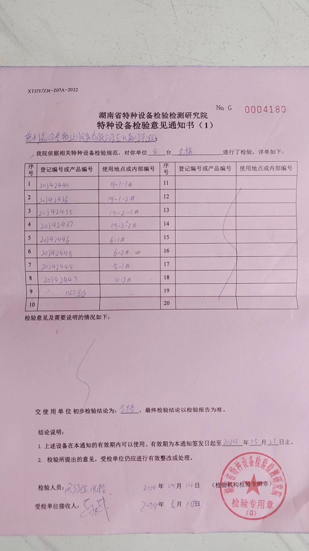 三、 2024年5月14日张家界市特种设备检验检测研究院工作人员来我们澧水嘉园小区,就我们小区5、6、19栋共8台电梯进行年度检测,检测结果均为合格,具体见以下图片: