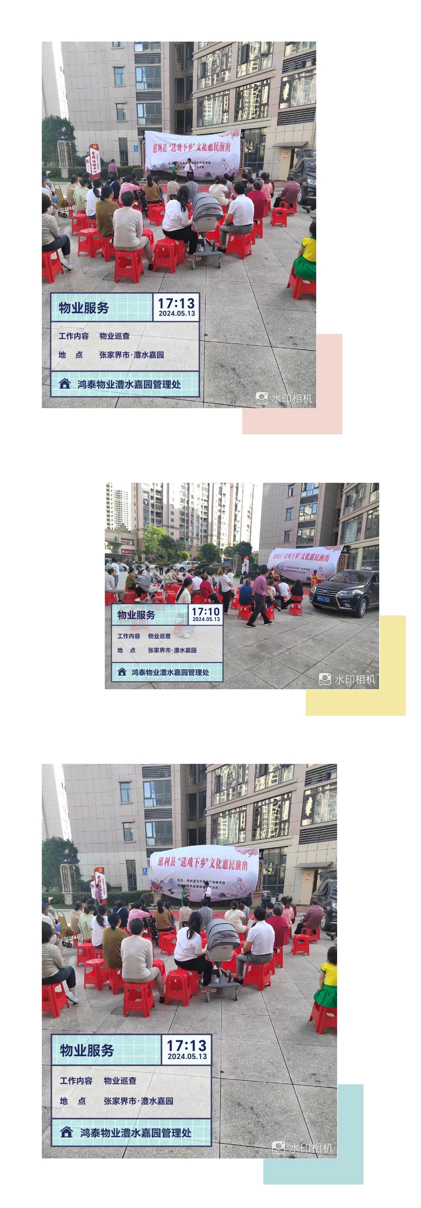 二、 “送戏下乡到家门 文化惠民暖民心”演出活动,于2024年5月13日下午4点半在澧水嘉园5栋和6栋之间的小广场已开展戏曲与现代舞的文艺演出。