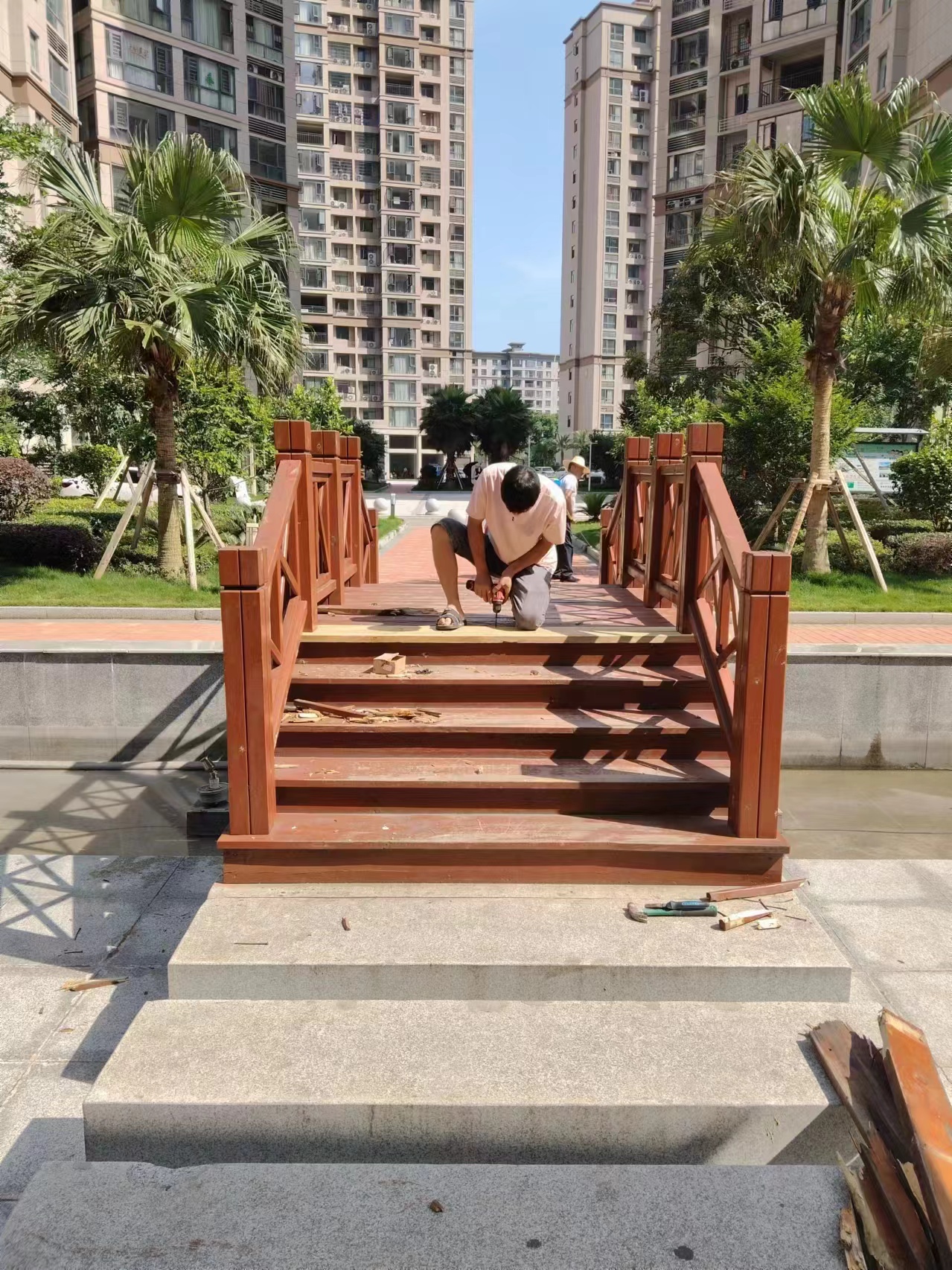 五、小区清风亭的木质走廊产生了破损现象,物业服务中心已安排工作人员进行了修缮。