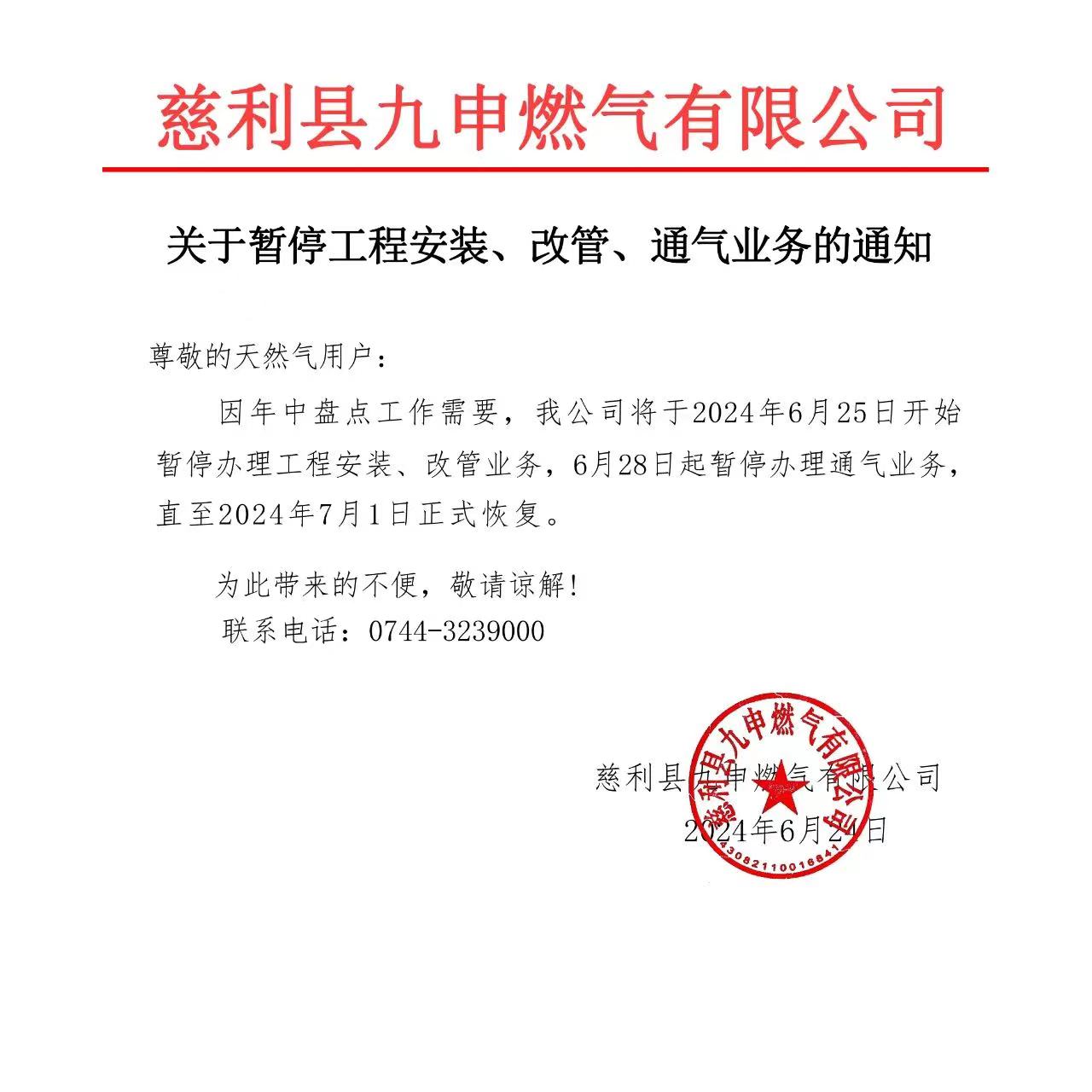 关于天燃气暂停工程安装、改管、通气业务的通知