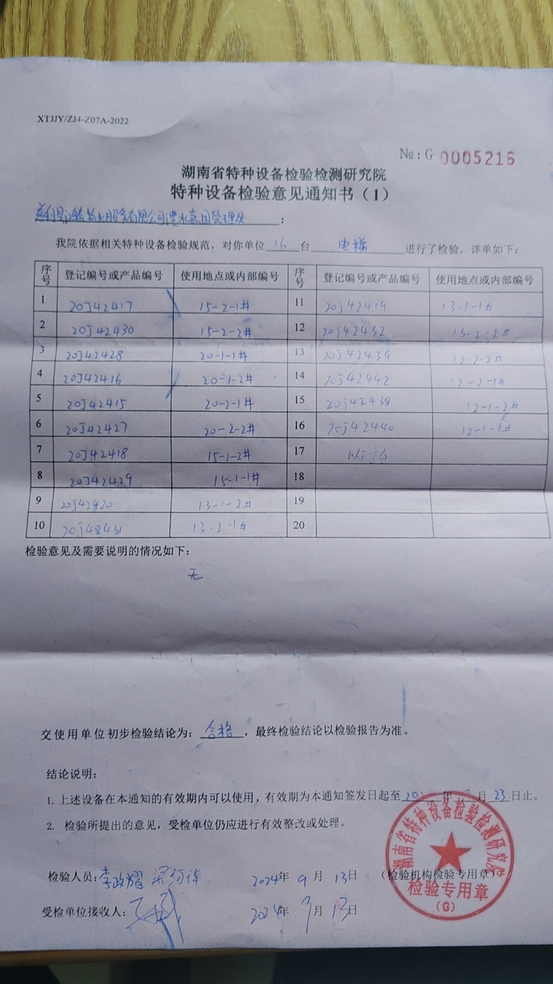 2024年9月13日张家界市特种设备检验检测研究院工作人员来我们澧水嘉园小区,就我们小区12、13、15、20栋共16台电梯进行年度检测,检测结果均为合格,具体见以下图片: