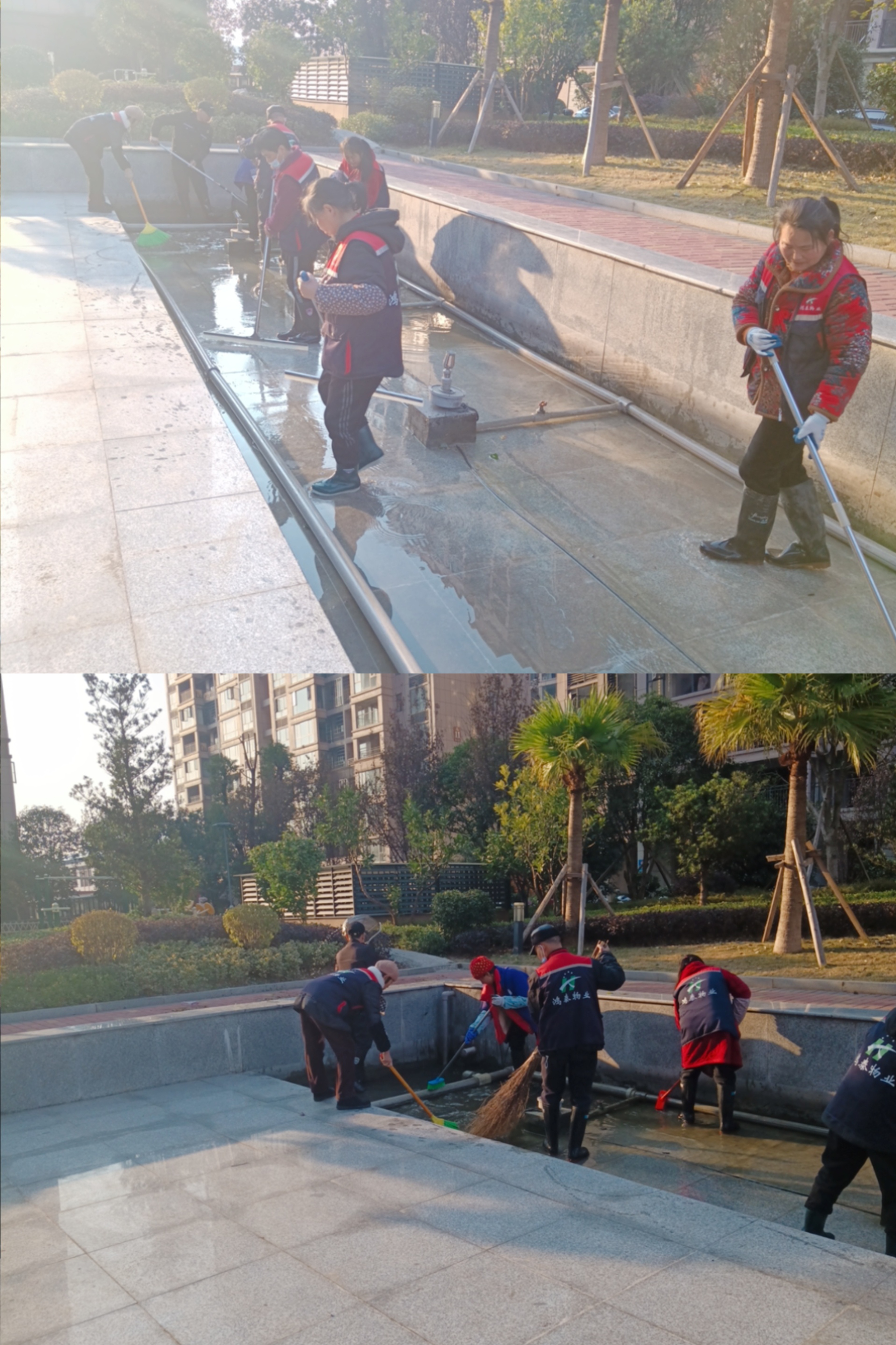 四、物业组织保洁人员对园区内的景观水池进行了全面清洗与维护。