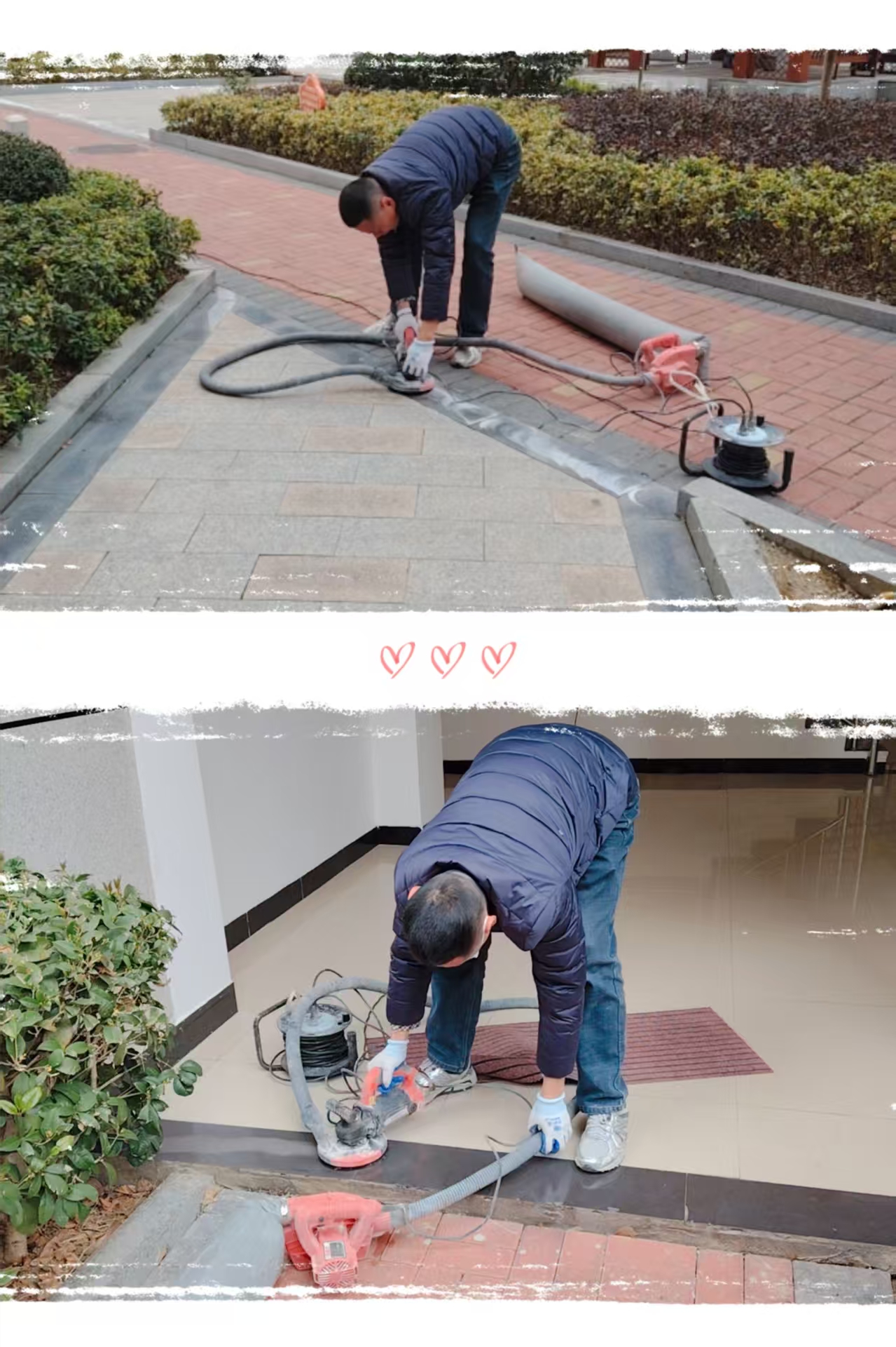 二、为了防止路面湿滑,工程师傅将小区内易滑瓷砖进行了打磨。