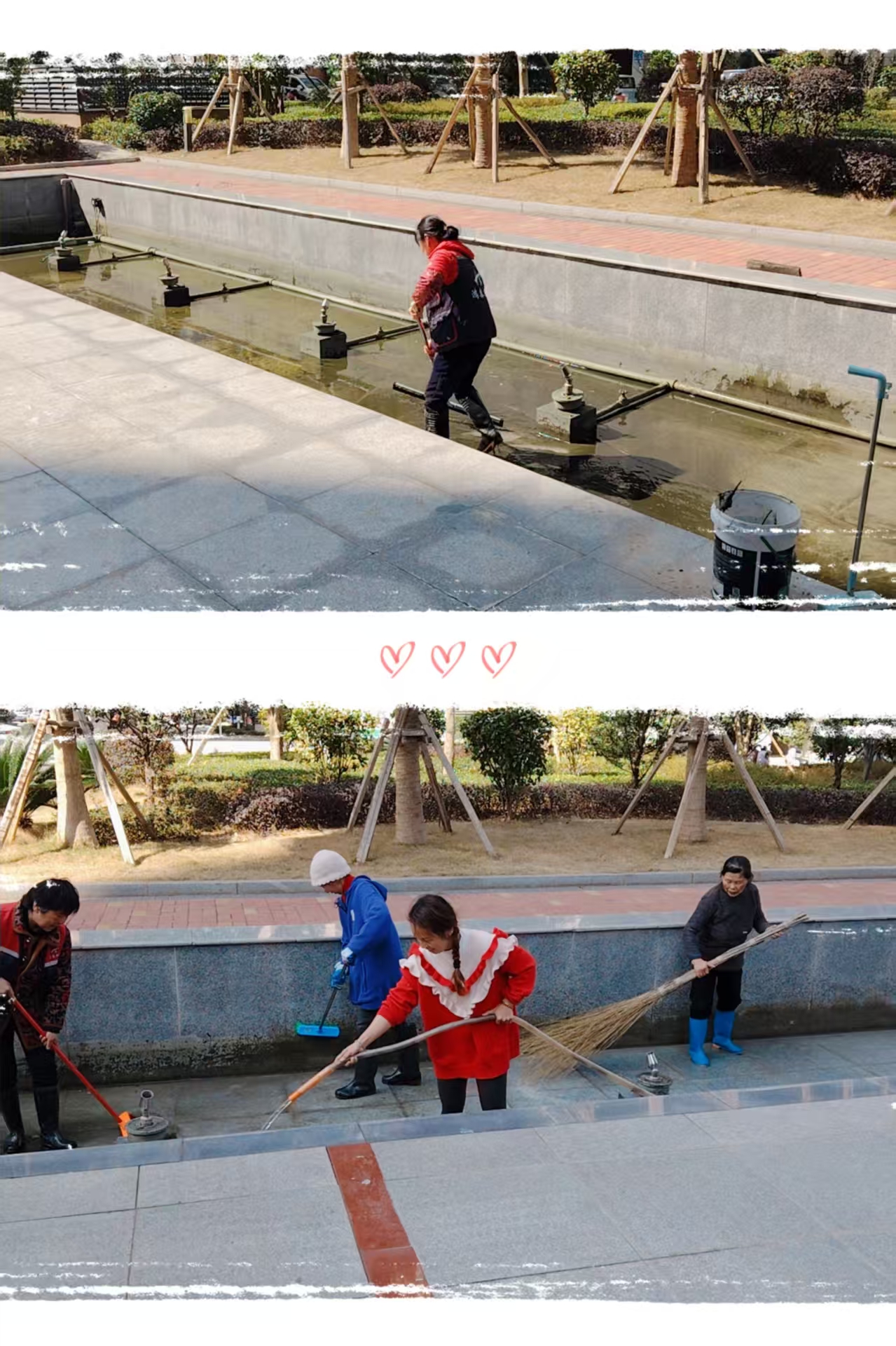 三、近日物业工作人员拿着扫把、刷子等工具下到小区内凉亭水池中,对水池四壁和池底进行了全面的冲刷和清洁。