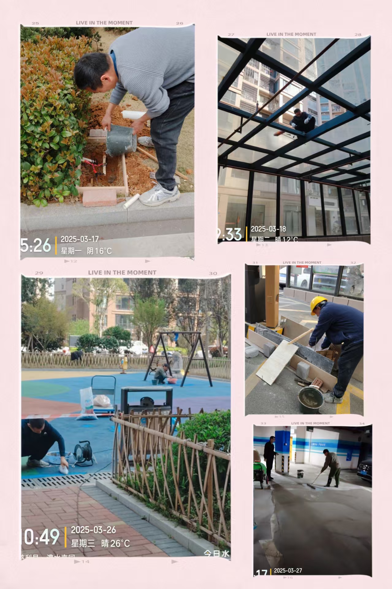 四、工程部人员对地下车库出入口道闸、小区公共照明路灯、儿童游乐场、塑胶跑道进行了修缮。